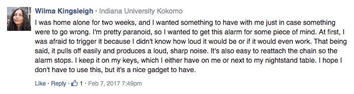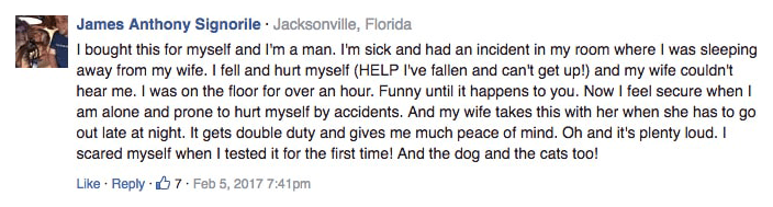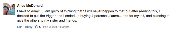 “this alarm is great for women, the elderly, children, night workers, for anyone who needs to feel SAFE when they are out or alone.”